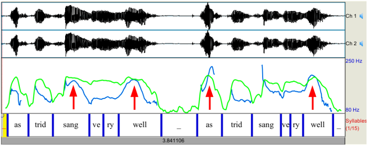 Some properties of the two utterances are immediately obvious. In the main accented syllables sang and well in the first utterance, and as and well in the second, the high intensity (green curve) and high fundamental frequency (blue curve) are very clear. Duration relations are not so clear: in the first example the accented syllables sang and well are longer than the other syllables, but in the second example unaccented strid is longer than accented as.