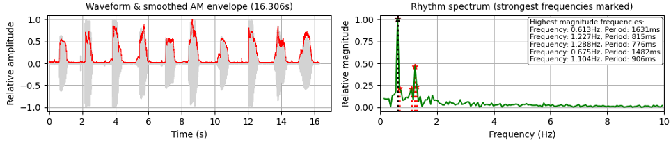By using spectral analysis with a Fast Fourier transform, more precise results can be calculated: Figure 2 (right) shows that the main frequency peak is indeed found at about 1.858 Hz, exactly as measured by hand, with other frequencies surrounding the main frequency, due to irregularities in syllable structure and durations. Higher, weaker frequency peaks, most clearly at 5.944 Hz (period of 168 ms) also appear, also due to syllable components and their durations.
