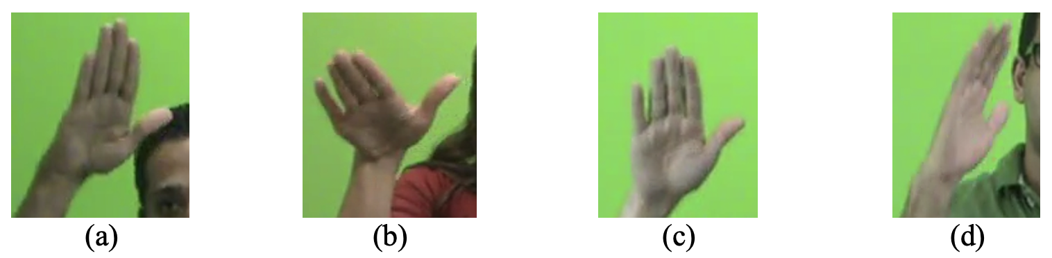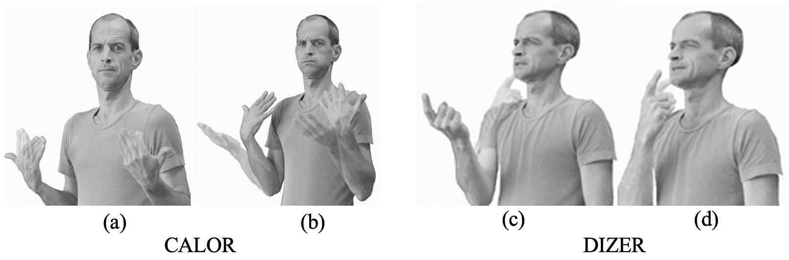 No entanto, conforme mostram Alecrim e Xavier (2019), nem toda variação na configuração de mão parece ser fonológica. Sua análise de diferentes realizações de um mesmo sinal indicou, por exemplo, a ocorrência de micro-variações referentes ao grau de abdução do polegar (comparem-se 3a e 3b), de adução do dedo mínimo (comparem-se 3a e 3d com 3b-c) ou mesmo de extensão dos dedos (comparem-se 3a-c com 3d). Considerando que essas variações devem decorrer de diferentes fatores fisiológicos e/ou situacionais, os referidos autores as tratam como variações fonéticas.
