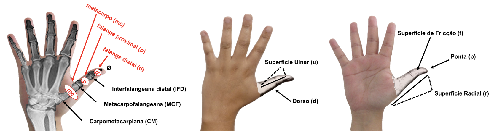 O polegar é composto de três ossos: a falange distal (d), a falange proximal (p) e o metacarpo (mc), osso mais longo que se liga ao carpo (c). Esses ossos se articulam através de três articulações: a articulação interfalangeana distal (IFD), a articulação metacarpofalangeana (MCF) e a articulação carpometacarpiana (CM). Os ossos e as articulações do polegar bem como as partes dele que podem contactar outros dedos são ilustrados na Figura 4.