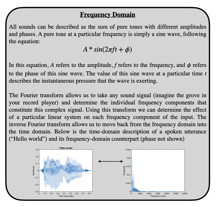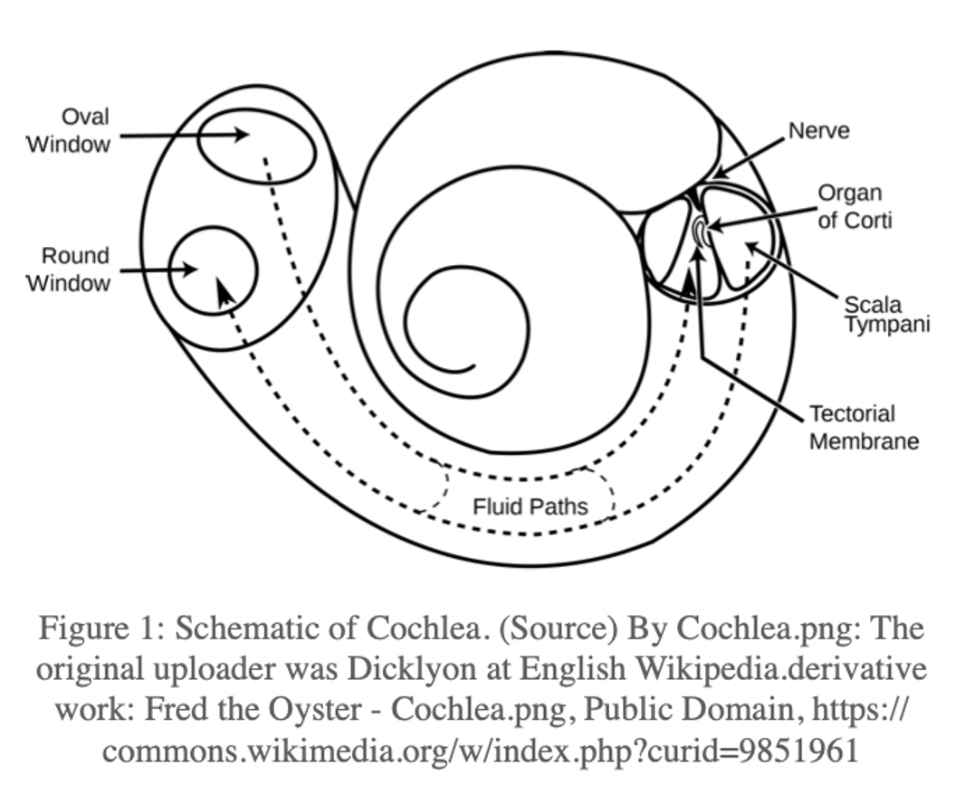 When a sound is emitted from a source, pressure waves travel away from that source. A sound is perceived as sound by an individual if the pressure waves result in a deflection of the eardrum (tympanic membrane). The power transferred from the air to the tympanic membrane must then be transferred to the fluid-filled cochlea. This is done through a series of middle ear bones (ossicles) that amplify this power and focus it on a much smaller membrane (oval window) at the base of the cochlea. The cochlea is a spiral structure embedded in the temporal bone, and contains three fluid-filled ducts (a vestige of our aquatic evolutionary origins). Pressure is applied externally to the oval window, and having entered the cochlea, must ultimately be transduced into a neural signal. This is accomplished by hair cells in the organ of Corti, which are tethered to the tectorial membrane. Pressure waves in the cochlea result in vibration of the basilar membrane at the base of the organ of Corti, which results in a shearing motion of the tethered (inner) hair cells. This shearing motion leads to depolarization of the hair cell, which results in the firing of an action potential. Hair cells are enervated by auditory nerve fibers, which carry information to the cochlear nucleus, and through a cascade of brainstem and midbrain structures, information is carried to the primary auditory cortex. Critically, a width and stiffness gradient in the basilar membrane allows vibrations at particular frequencies to resonate at specific locations along the basilar membrane. Higher-frequency sounds resonate at the base of the cochlea, while lower-frequency sounds resonate at the apex of the cochlea. This tonotopic organization is critical for our perception of sounds. Interestingly, psychoacousticians have long observed that low-frequency tones are more effective at masking high frequency tones than vice versa, a phenomenon called “upward spread of masking”. This is because the vibration pattern in the cochlea for a sound at a particular frequency is asymmetric, with a much longer tail extending at higher frequencies (this asymmetry can help explain why age-related hearing loss tends to affect higher frequency regions of the cochlea).