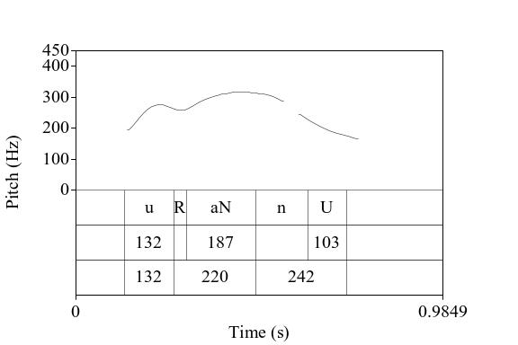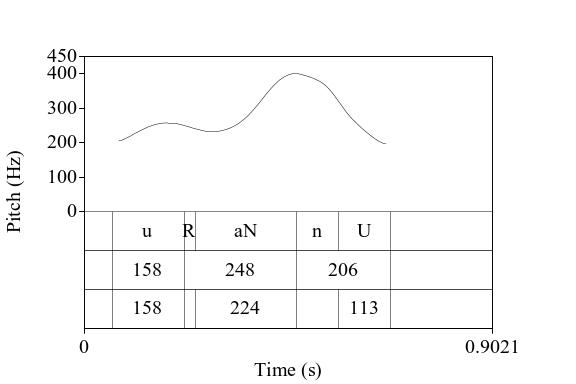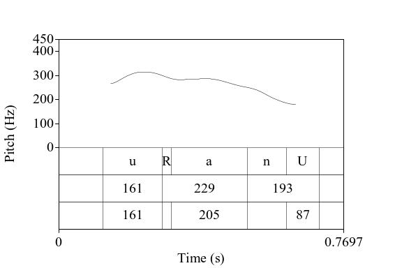 A figura abaixo, retirada de Raso (2023) mostra a realização da sequência segmental Urano com três formas ilocucionárias diferentes: asserção de resposta, expressão de incredulidade e confirmação, depois repetida com atitude diferente.